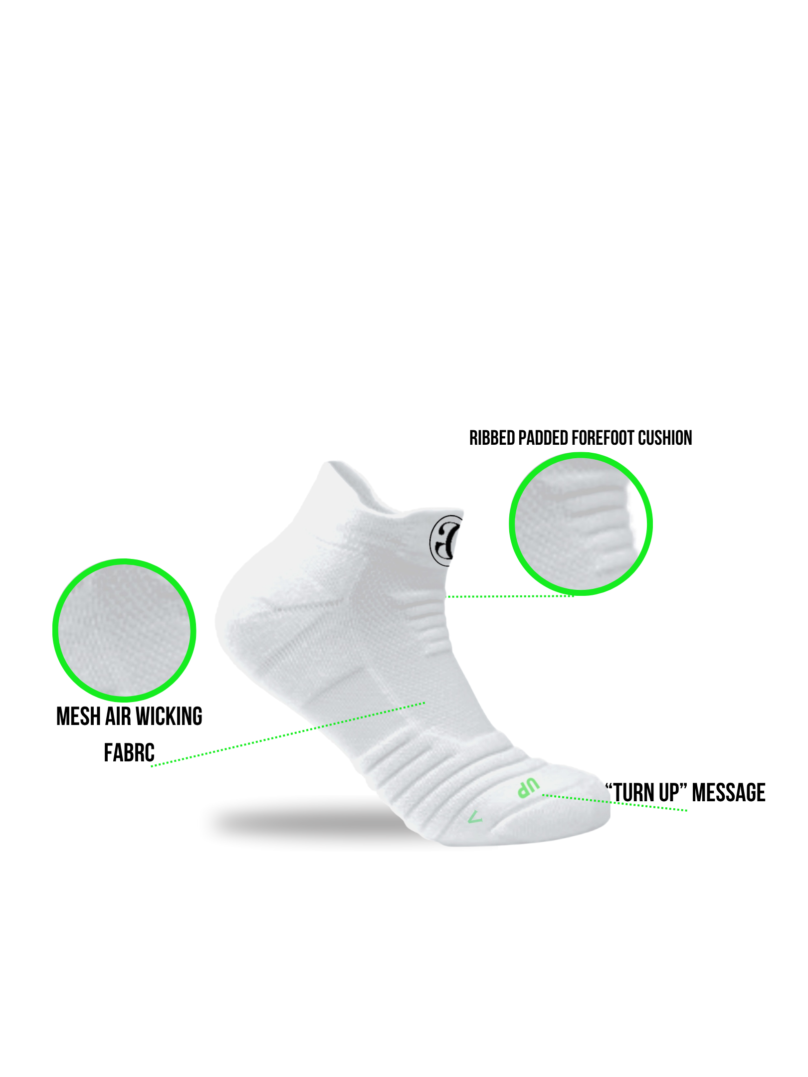 “Turn Up” every time you put these on. These socks are engineered with breathable air-wicking mesh zones to keep your feet dry and locked in, while the soft stretch fabric moves with you, not against you. Luxury feel and drip every step on the field…Every time you put these on, pray for your opponent!